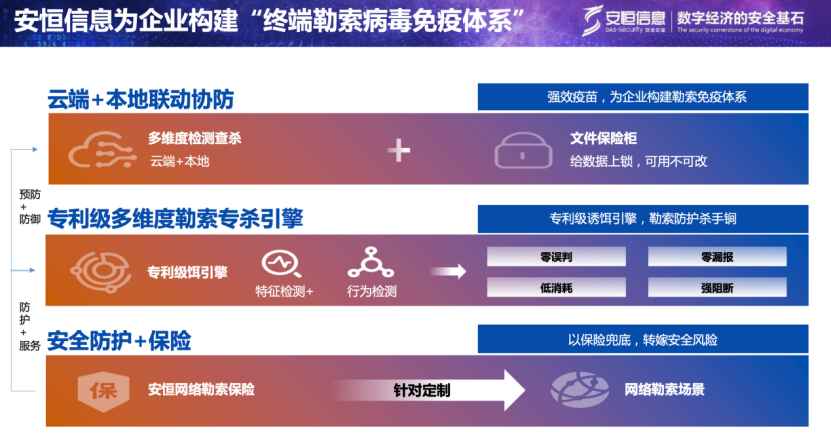 2021年4月安恒EDR推出“勒索病毒口罩&疫苗”創(chuàng)新解決方案以及防勒索U盤。該方案圍繞數(shù)據(jù)防勒索為目標,以資產(chǎn)為中心構(gòu)建了勒索風險處置閉環(huán),包括、監(jiān)測、預防、防御、響應、溯源、加固6大階段,包含多項核心技術(shù)專利。“防勒索疫苗”方案一經(jīng)推出,立刻引發(fā)了行業(yè)震動,在勒索攻擊愈發(fā)猖狂的形勢下猶如給廣大的企事業(yè)客戶注射了一支強心劑。