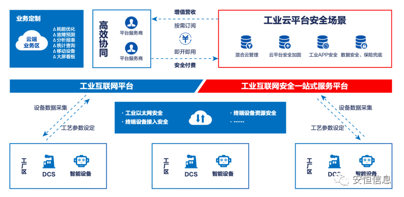 以工業互聯網安全一站式服務平臺為基礎,安恒信息聯動上游大中型工業互聯網平臺,將安全能力與工業應用深度融合;通過安全賦能,將安全資源向中下游中小制造業企業開放,鏈接產業鏈,打造工業互聯網安全解決方案的生態新格局。