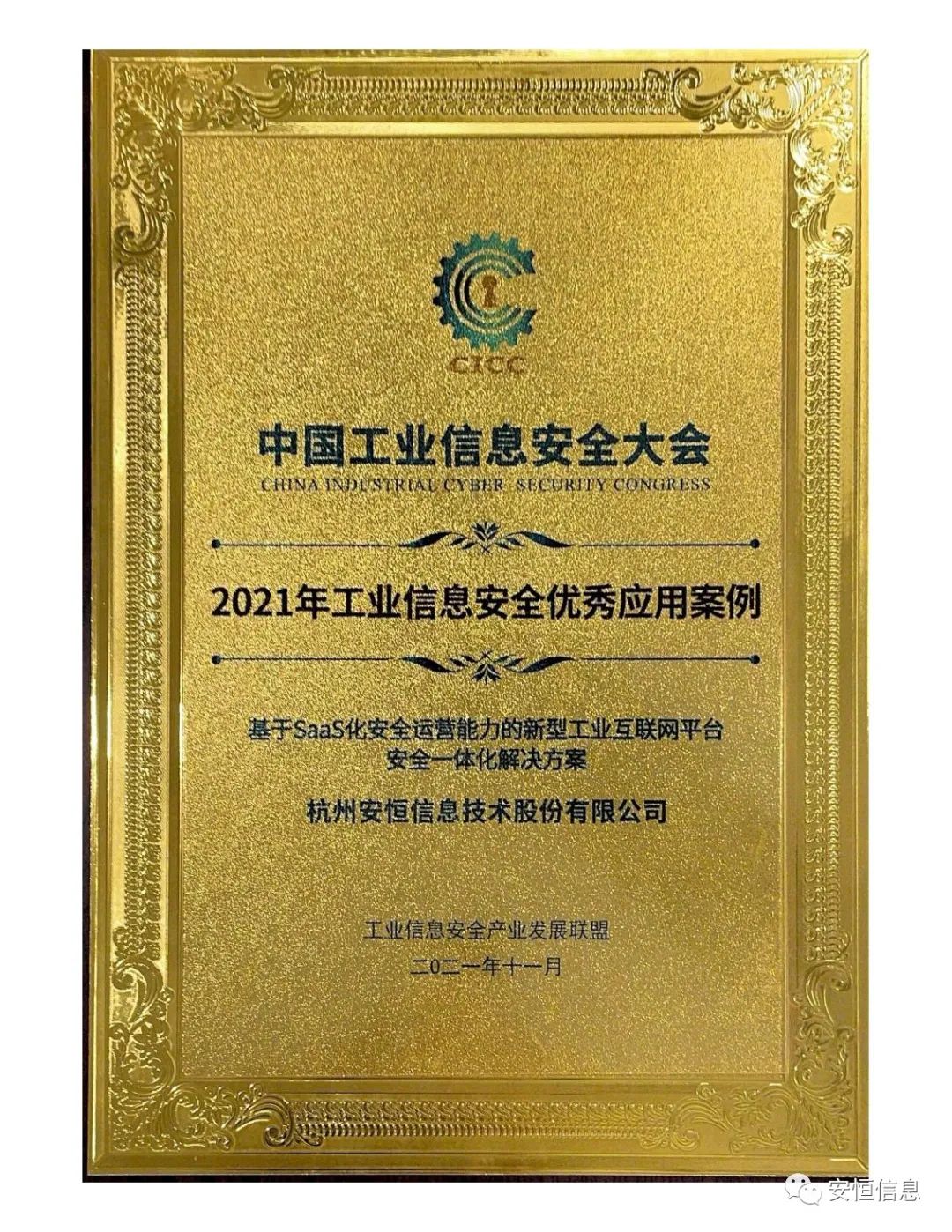 憑借基于SaaS化安全運營能力的新型工業互聯網平臺安全一體化解決方案獲得2021年工業信息安全優秀應用案例,這也是安恒信息連續第4年獲得此獎項。