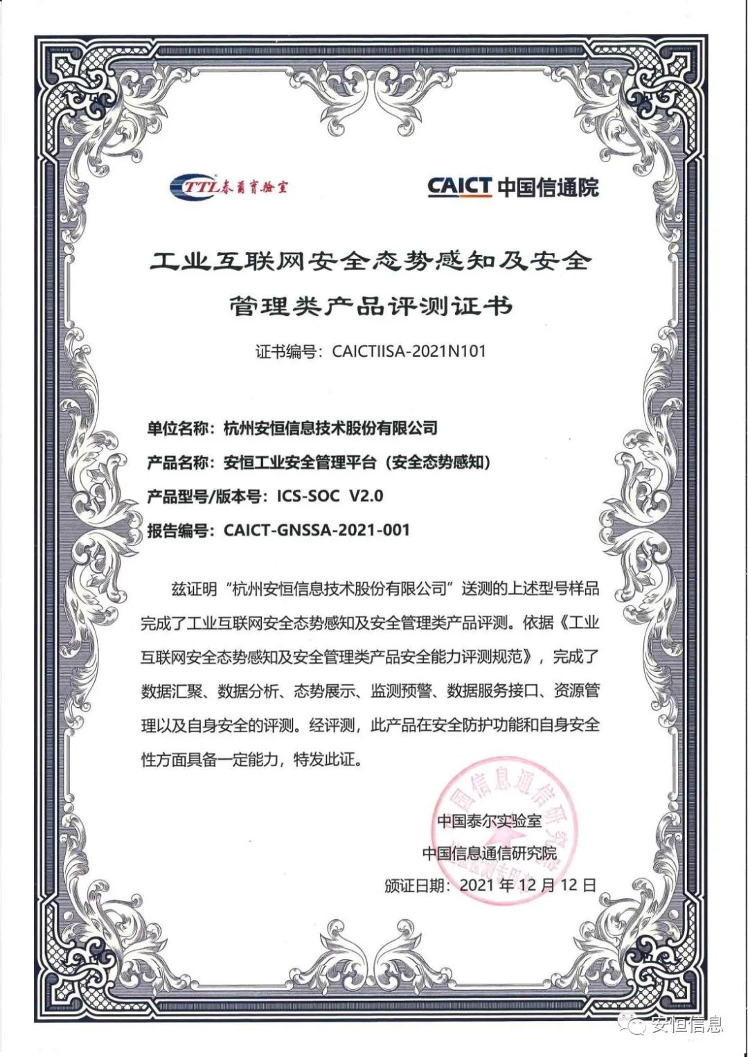工業互聯網安全態勢感知平臺和工業安全監測審計平臺分別獲信通院產品評測能力認證。