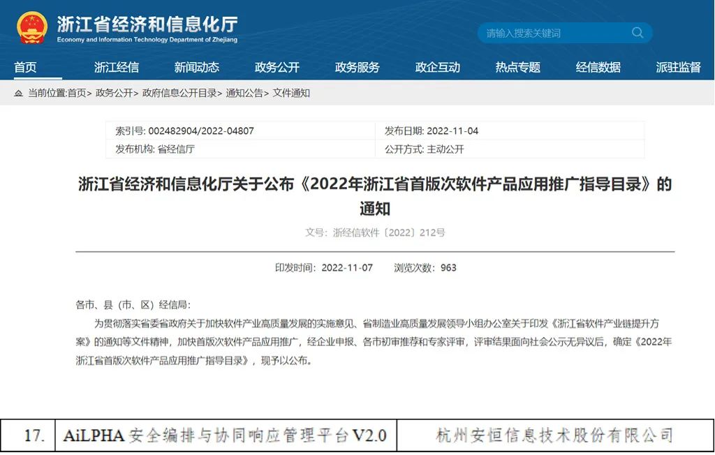 近日,浙江省經(jīng)濟和信息化廳公布《2022年浙江省首版次軟件產(chǎn)品應用推廣指導目錄》,安恒信息AiLPHA安全編排與協(xié)同響應管理平臺(以下簡稱“AiLPHA SOAR平臺”)經(jīng)過層層審查、多方評定,被納入首批目錄。
