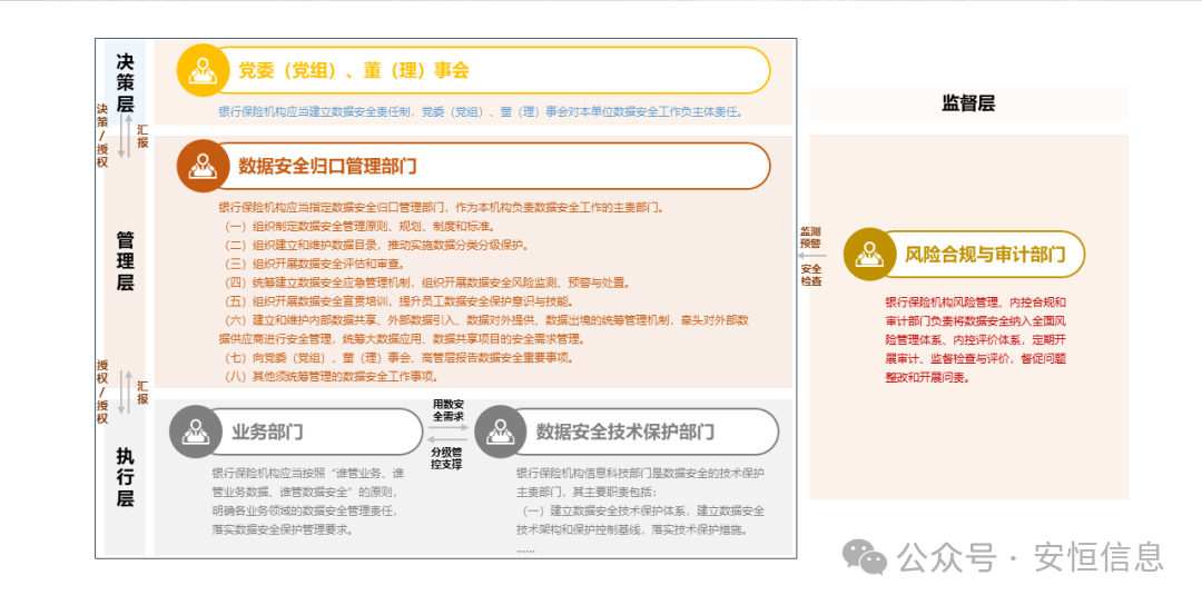 一是明確數據安全治理架構,通過責任制、歸口管理部門、業務部門、風險合規與審計部門、數據安全技術保護部門的職責定義,明確組織架構分工。銀行保險機構的科技部門,明確作為數據安全保護的技術支撐,非主責部門。