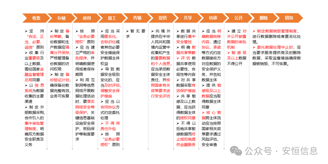 要求銀行保險機構建立數據安全技術架構,明確數據保護策略方法,采取技術手段保障數據安全。將數據安全保護納入信息系統開發生命周期框架,針對敏感級及以上數據明確安全保護要求,實現數據安全保護措施與信息系統的同步規劃、同步建設、同步使用。建立數據安全保護基線,把數據納入網絡安全等級保護,對存放或傳輸敏感級及以上數據的機房、網絡實施重點防護,在數據全生命周期內采取有效訪問控制管理措施,通過整體安全有效的措施方式保障數據完整性、保密性、可用性。