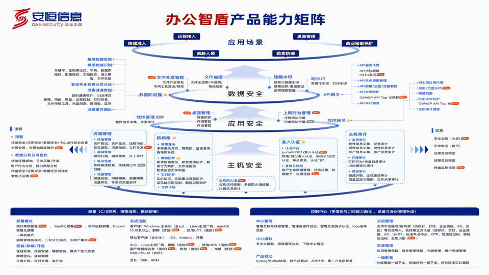 融合零信任、防病毒、主機審計、弱點檢測、文件加密保護、數據防泄漏、基線檢查、資產盤點、桌面管理、主機防火墻、隱形水印、綠色上網、網絡準入、虛擬桌面等多種業務。