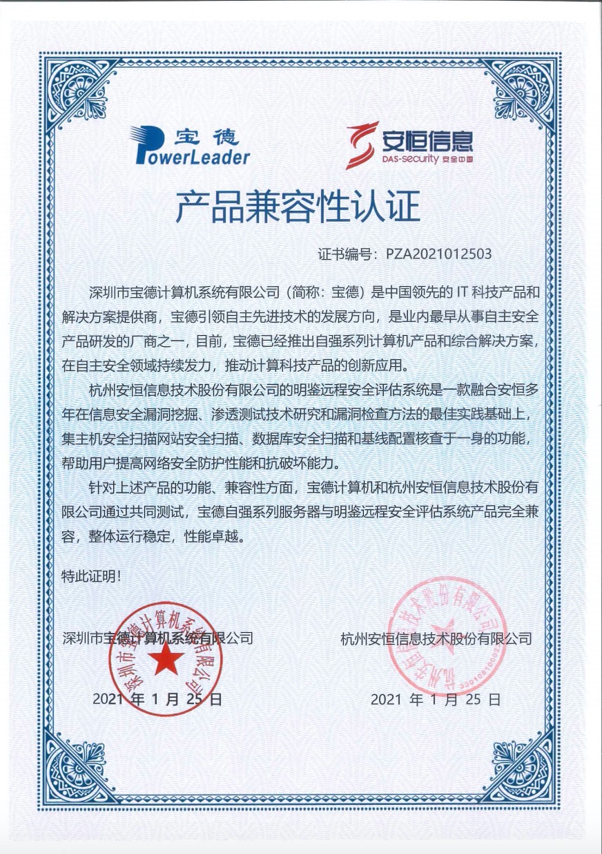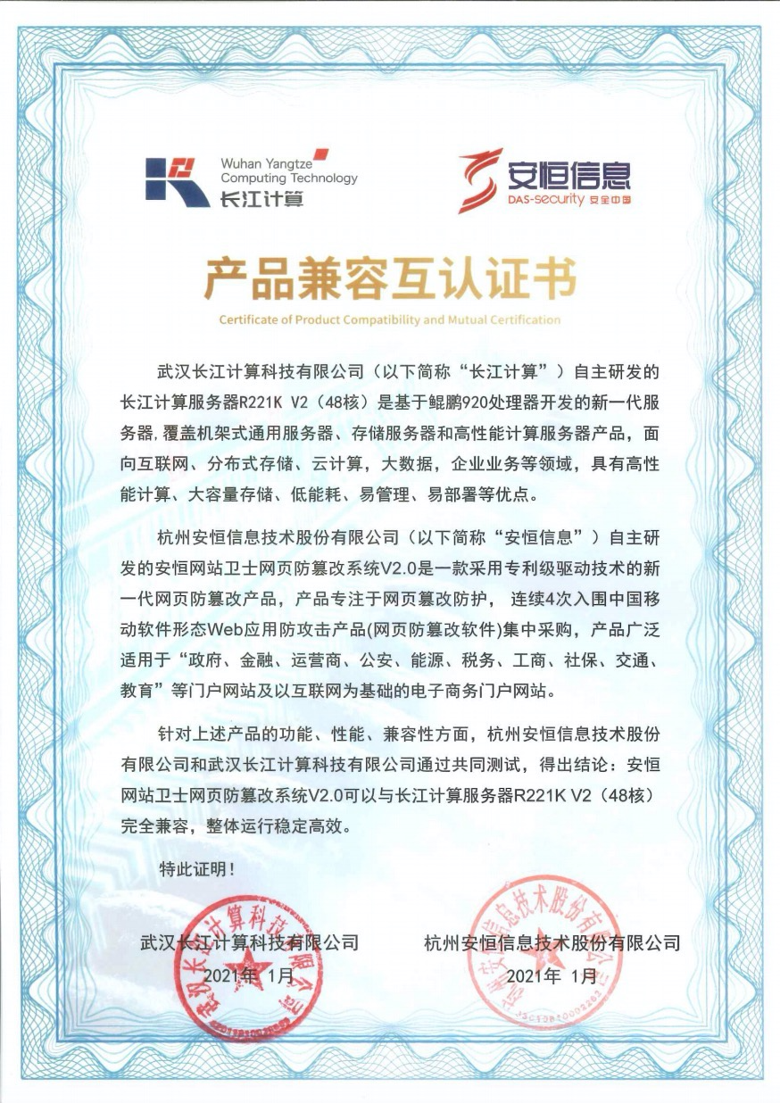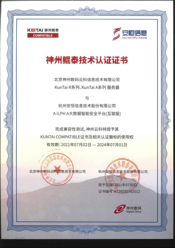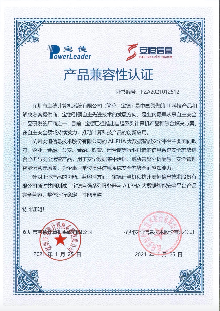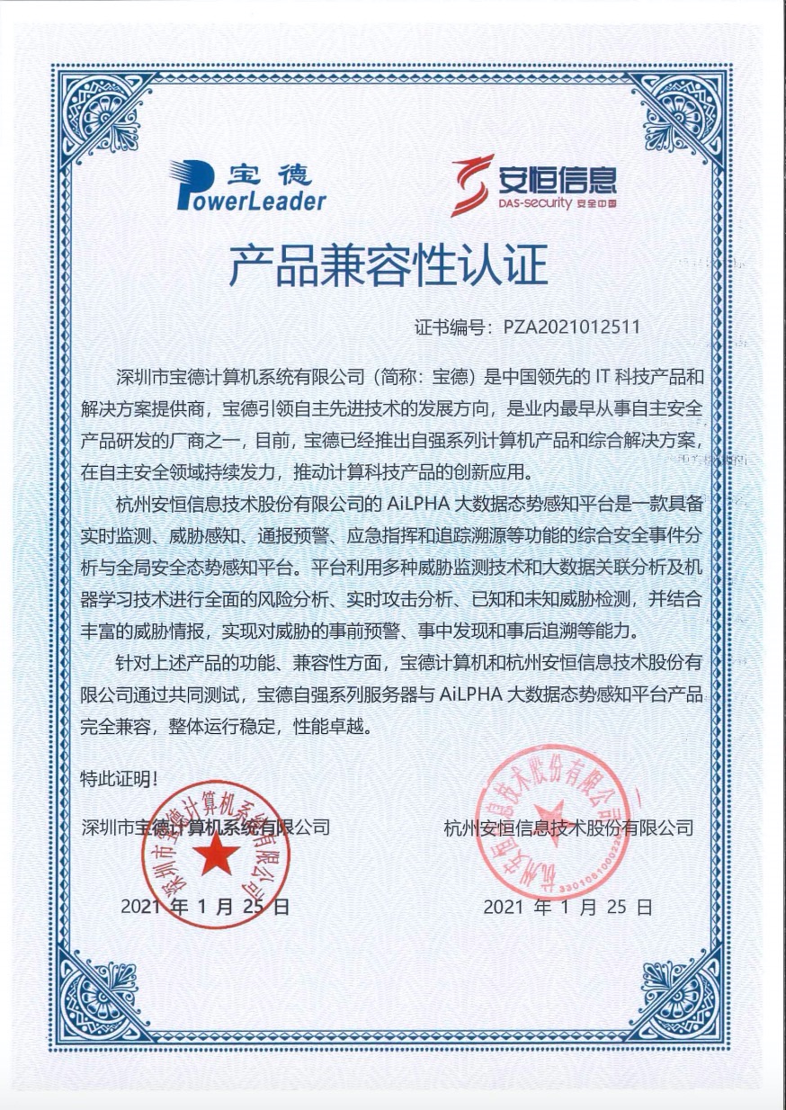 - 安恒信息AiLPHA大數(shù)據(jù)智能安全平臺、APT攻擊預(yù)警平臺分別與華為TaiShan 200系列完成兼容性測試。華為智能計算授予安恒信息HUAWEI COMPATIBLE證書及相關(guān)認(rèn)證徽標(biāo)使用權(quán)。