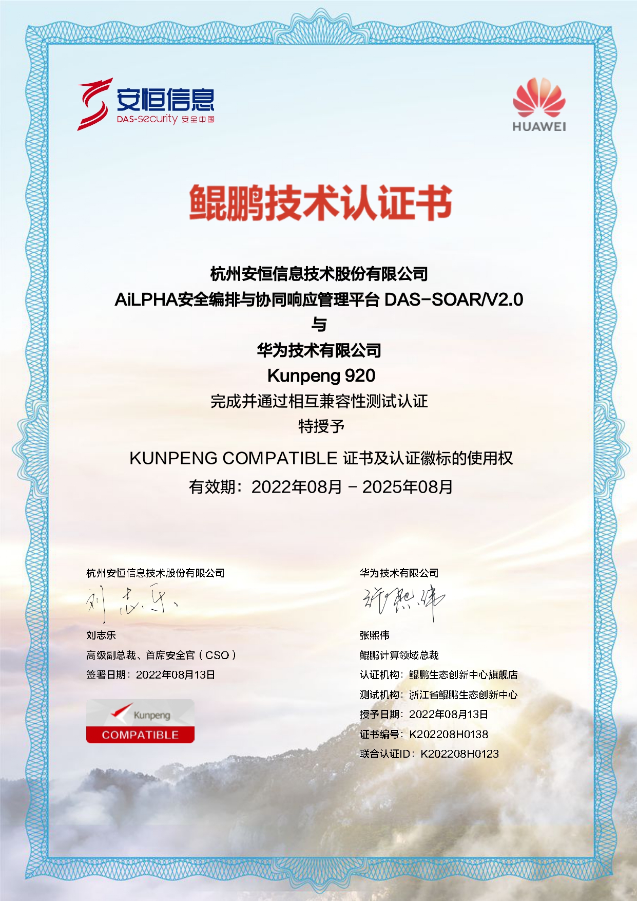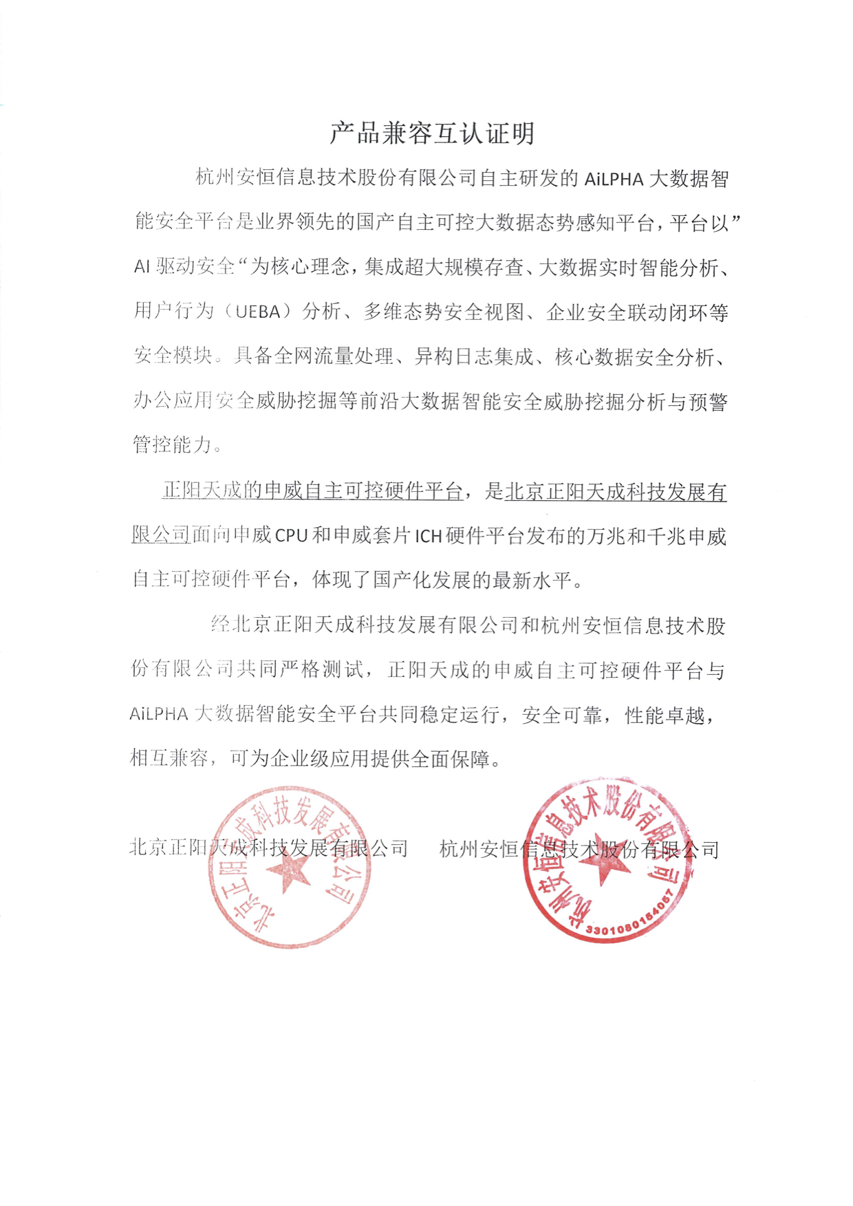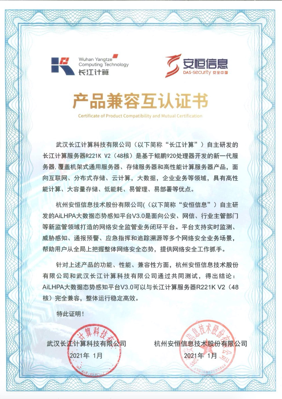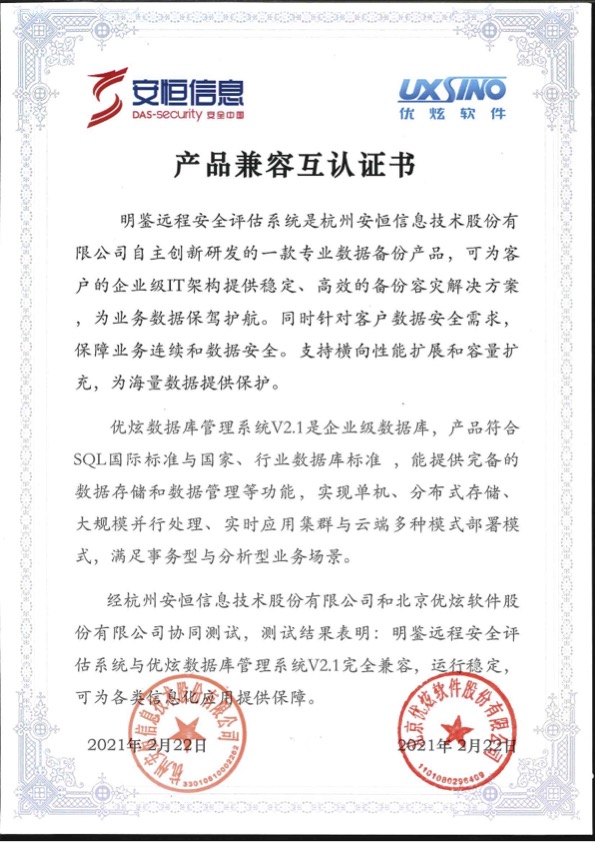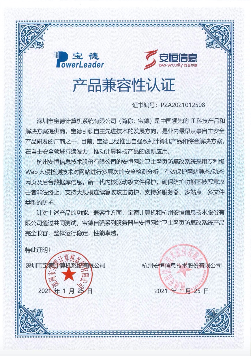 - 安恒信息AiLPHA大數(shù)據(jù)智能安全平臺、APT攻擊預(yù)警平臺分別與華為TaiShan 200系列完成兼容性測試。華為智能計算授予安恒信息HUAWEI COMPATIBLE證書及相關(guān)認(rèn)證徽標(biāo)使用權(quán)。