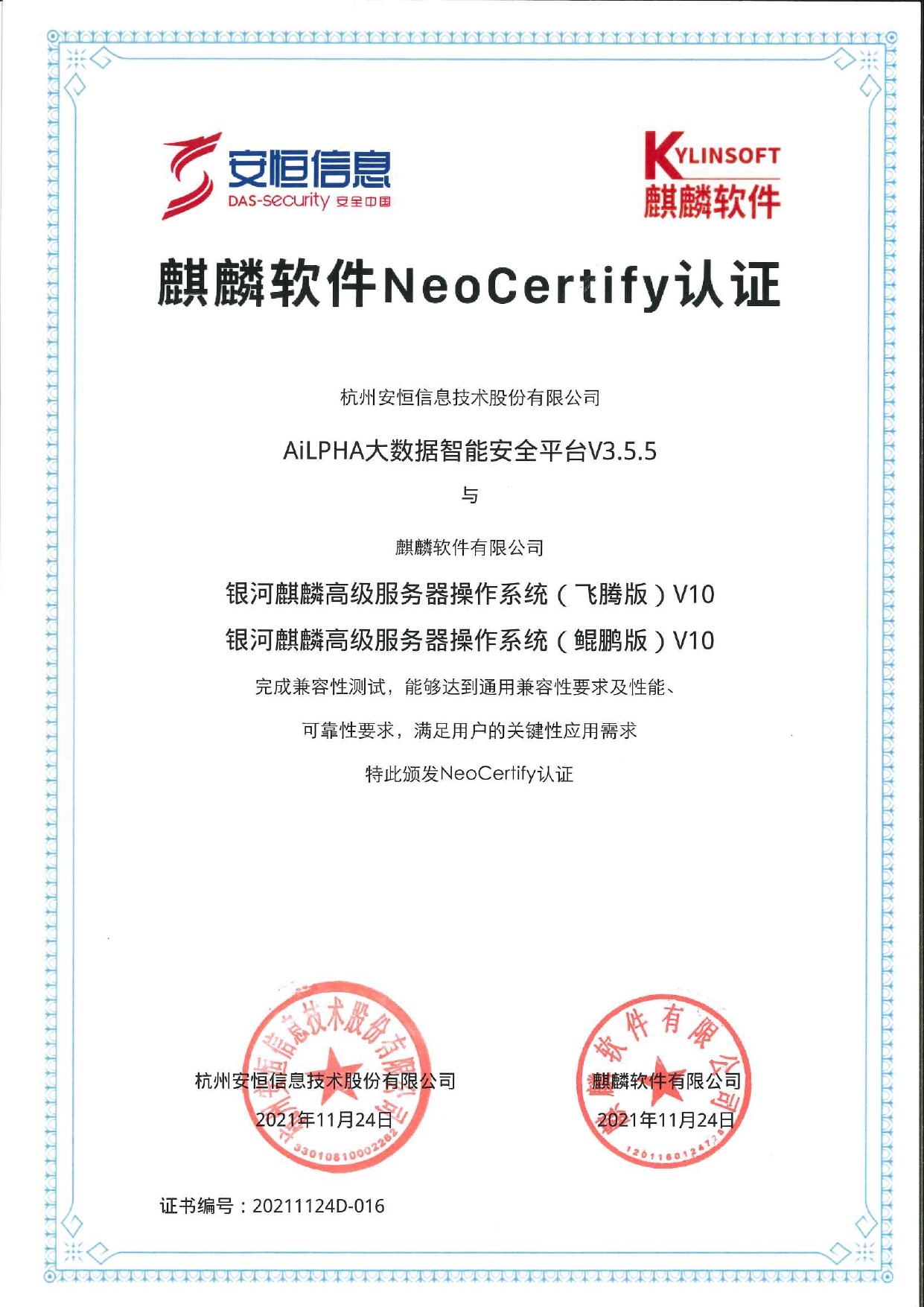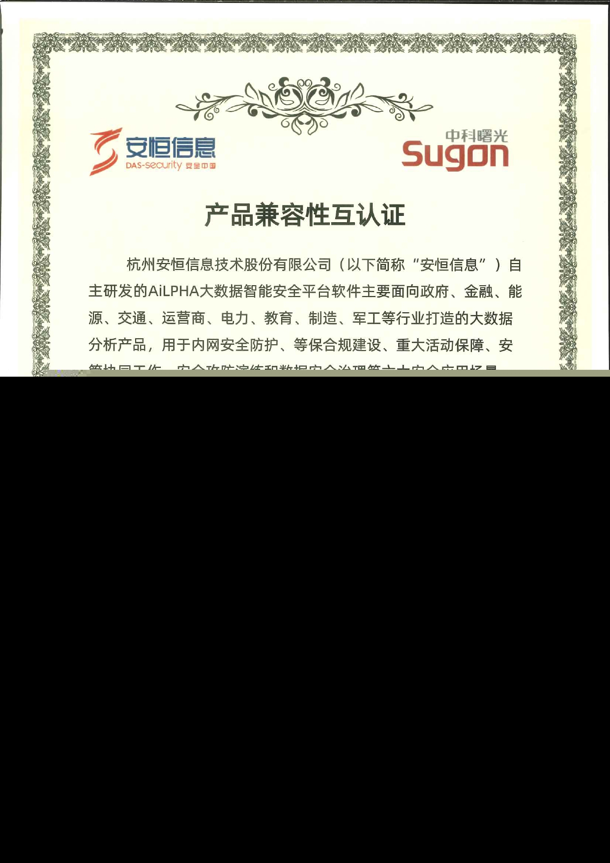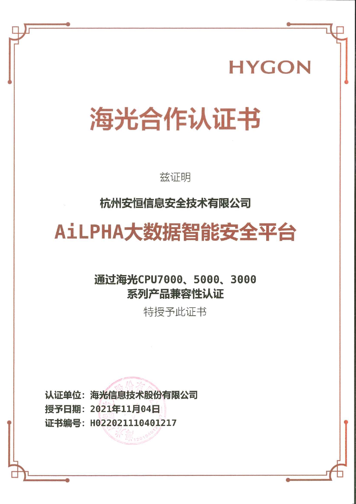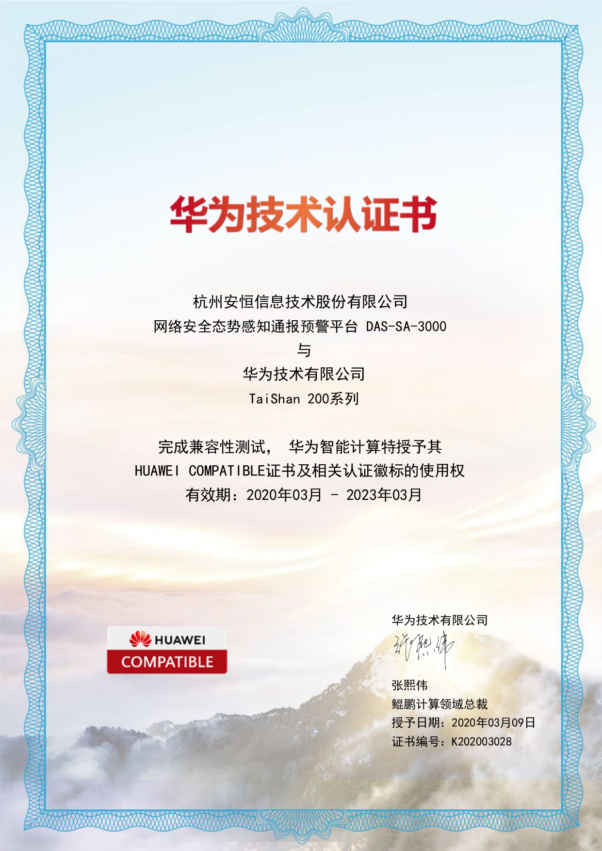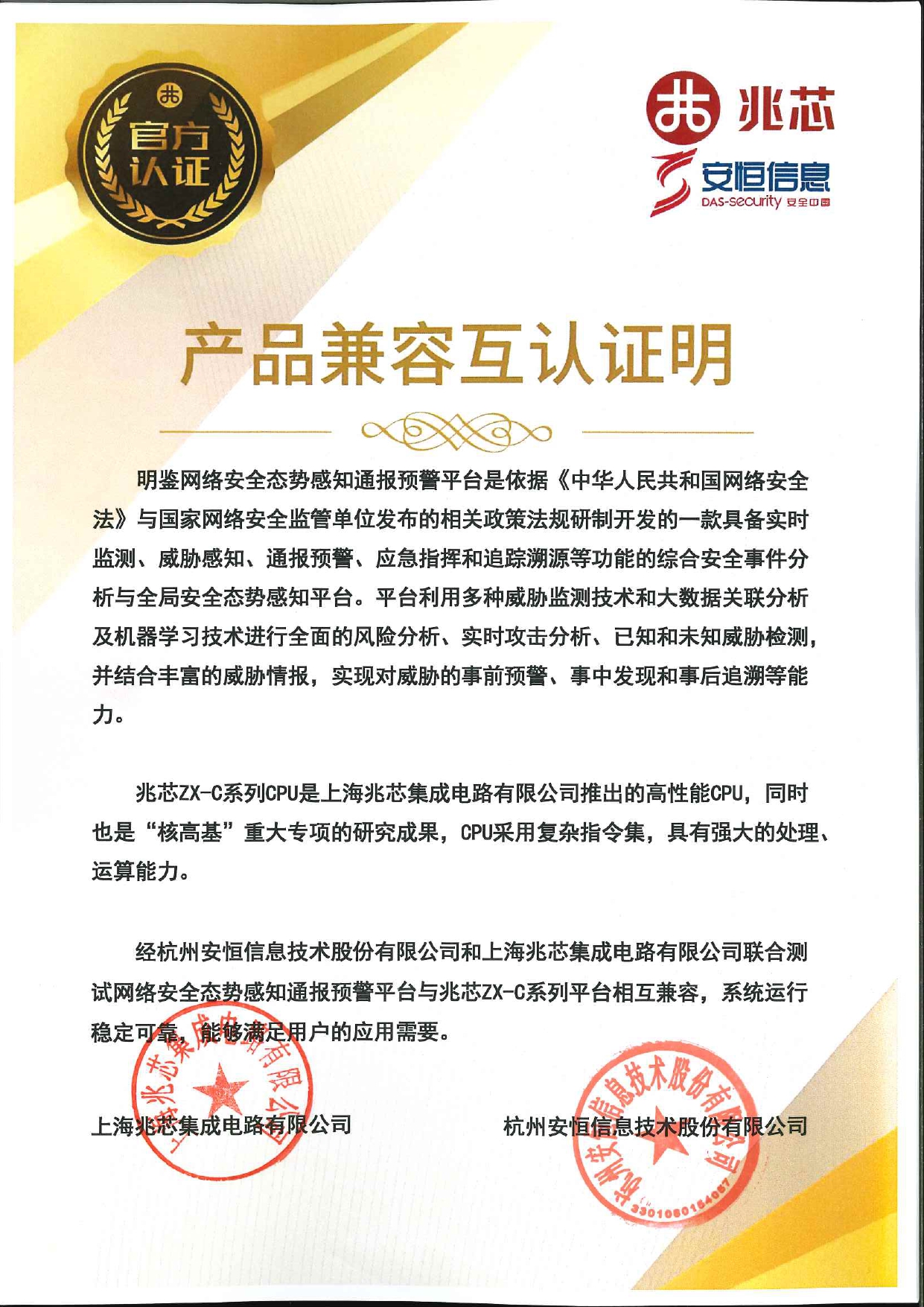 - 安恒信息AiLPHA大數(shù)據(jù)智能安全平臺、APT攻擊預(yù)警平臺分別與華為TaiShan 200系列完成兼容性測試。華為智能計算授予安恒信息HUAWEI COMPATIBLE證書及相關(guān)認(rèn)證徽標(biāo)使用權(quán)。
