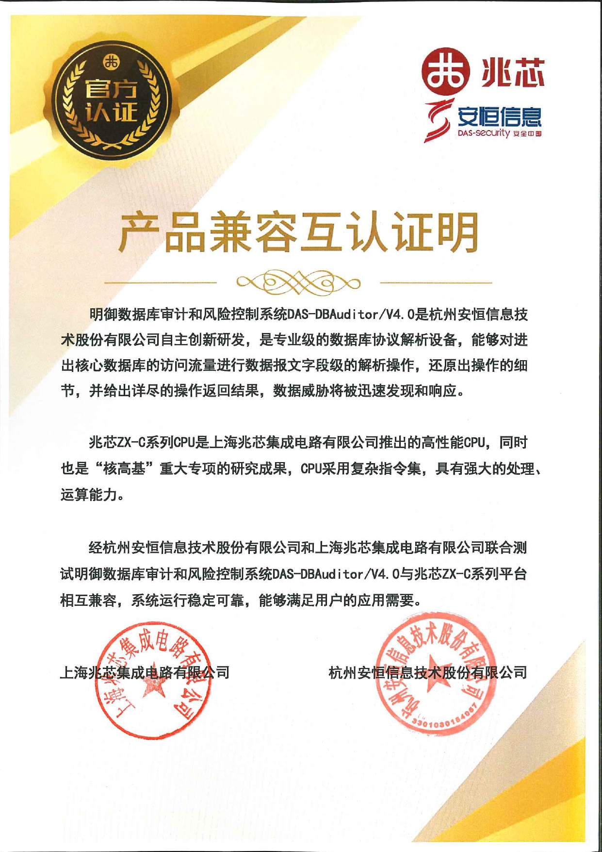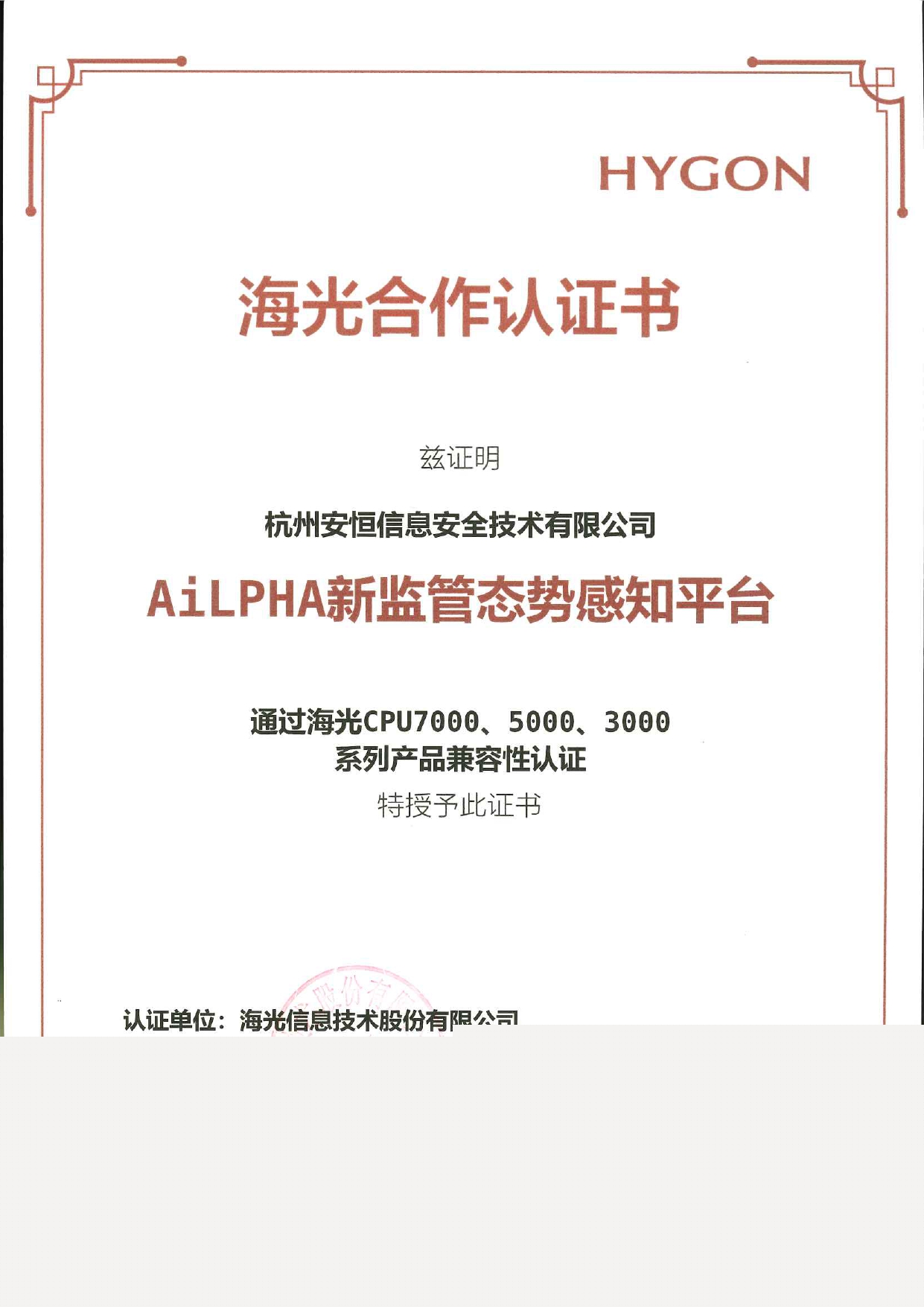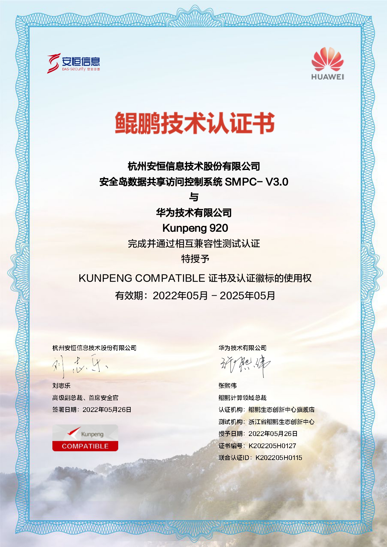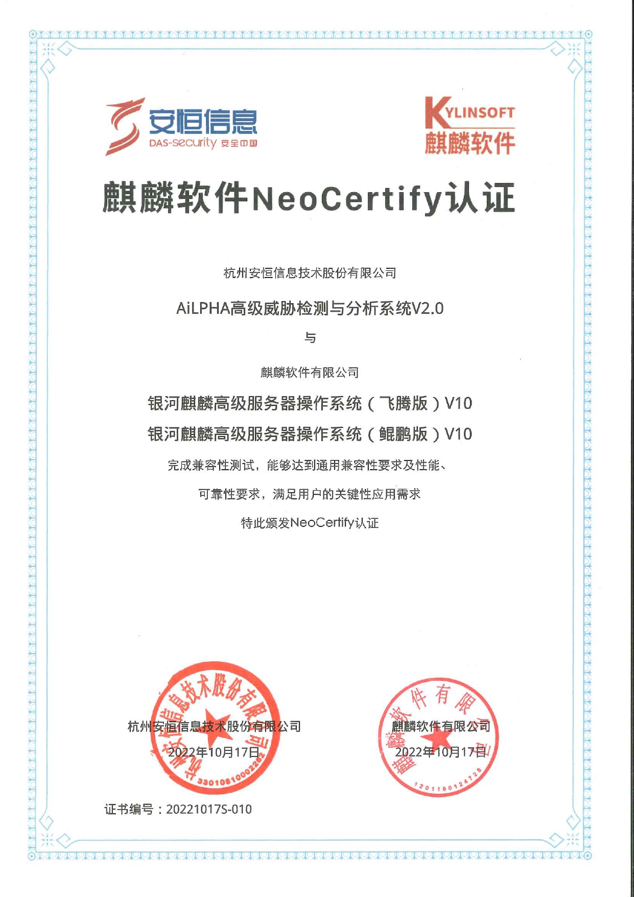 - 安恒信息AiLPHA大數(shù)據(jù)智能安全平臺、APT攻擊預(yù)警平臺分別與華為TaiShan 200系列完成兼容性測試。華為智能計算授予安恒信息HUAWEI COMPATIBLE證書及相關(guān)認(rèn)證徽標(biāo)使用權(quán)。