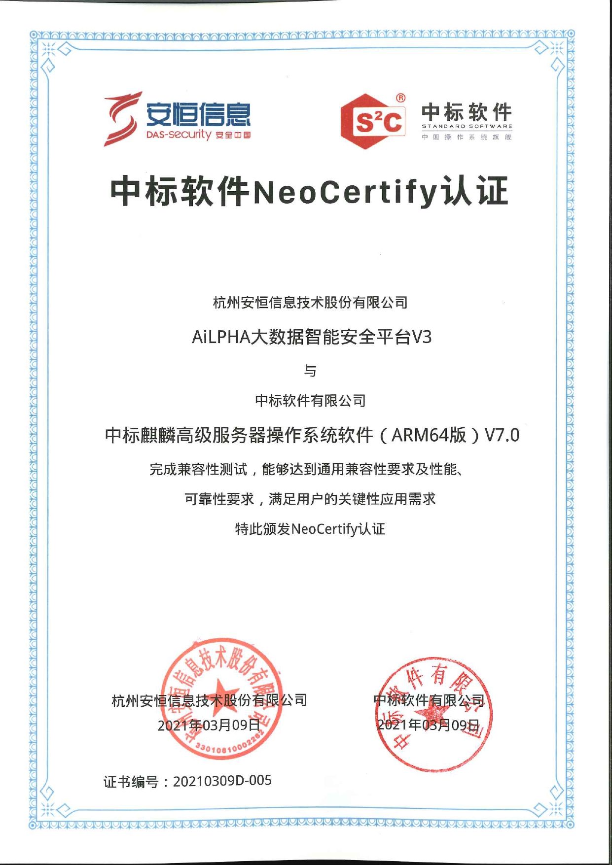- AiLPHA大數(shù)據(jù)智能安全平臺分別完成申威和深之度兼容性互認(rèn)證。