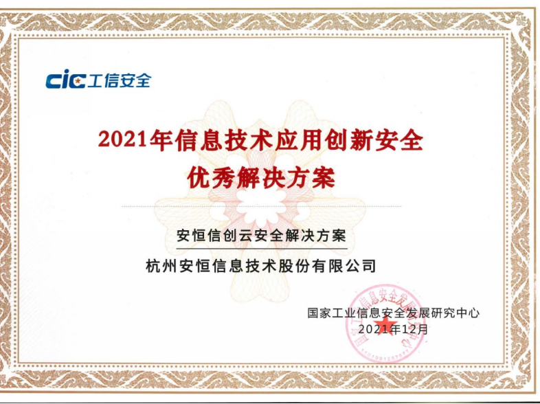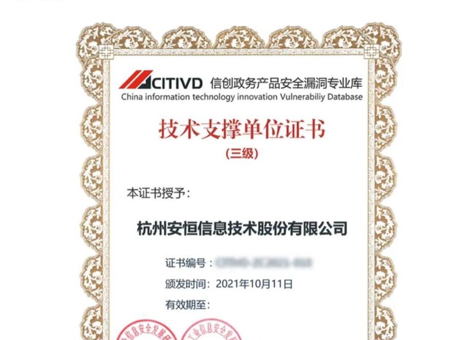 2022年3月,安恒信息獲得國家工業(yè)信息安全發(fā)展研究中心首批“信創(chuàng)政務(wù)產(chǎn)品安全漏洞專業(yè)庫技術(shù)支撐單位”證書。